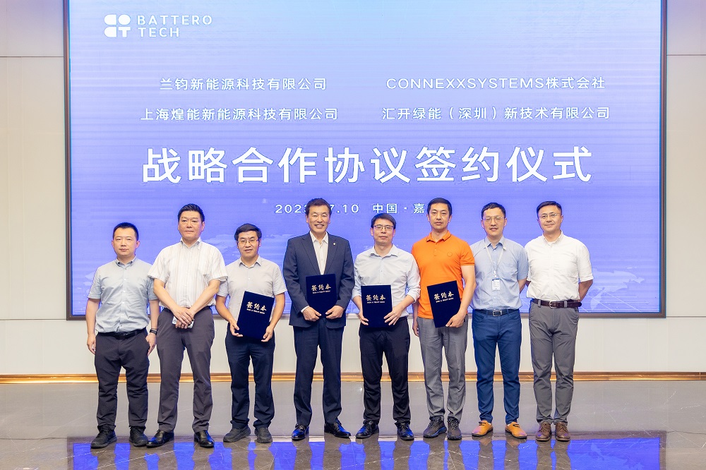 7月10日下午,兰钧新能源科技有限公司、CONNEXX SYSTEMS株式会社、上海煌能新能源科技有限公司和汇开绿能(深圳)新技术有限公司四方战略合作协议签约仪式举行。兰钧新能源CEO钟开富、储能事业部副总经理白峪豪,CONNEXX SYSTEMS株式会社社长塚本壽、事业部长肖宇生,上海煌能总经理刘鹏、副总经理秦浒佑、投资总监吴舒怀,汇开绿能总经理刘宜家等相关领导出席签约仪式。