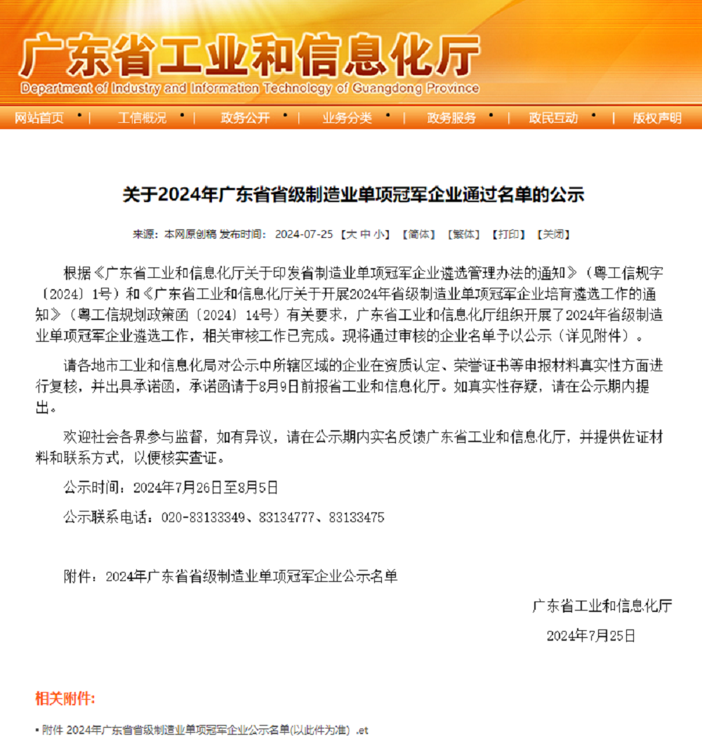 广青科技入选2024年广东省省级制造业单项冠军企业