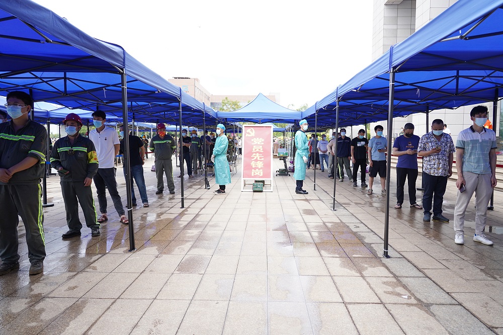 近期阳江迎来今年以来最强的持续性暴雨天气,这给全员核酸检测工作带来一定影响。为了应对恶劣天气,确保生产、防疫工作两不误,公司第一时间成立工作领导小组,制定详细的工作实施方案,召开疫情防控部署会议,争分夺秒做好各项前期准备工作。在时间紧、任务急的情况下,采购人员紧急购入60顶帐篷及雨衣雨具,安保人员加班加点、冒雨搭建检测通道。采样当天,公司党员先锋队、志愿者等工作人员积极协助医务人员,做好测温、扫码、采样等工作,整个环节运转高效,仅历时3个半小时便完成全员采样工作。