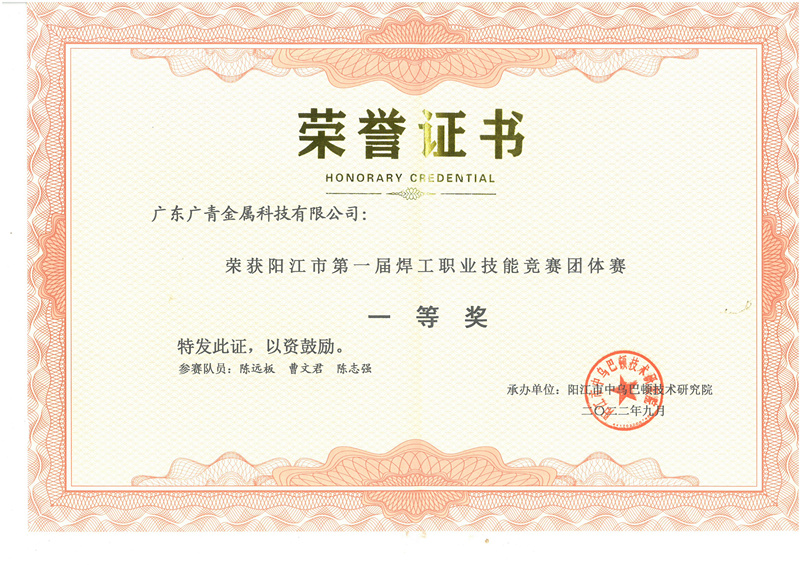 广青科技荣获阳江市第一届焊工职业技能竞赛团体赛一等奖
