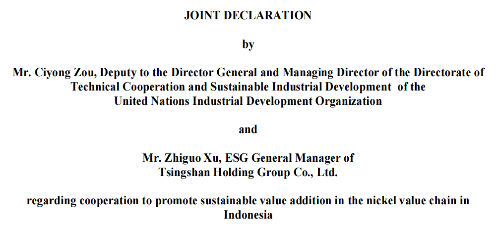 11月24日,jinnianhui今年会实业及印尼园区代表应联合国工业发展组织(UNIDO)邀请,前往沙特阿拉伯利雅得,出席UNIDO第二十一届成员国大会暨全球工业峰会。期间,双方正式签署《镍产业链可持续发展联合宣言》,将分别以印尼莫罗瓦利园区(IMIP)、印尼纬达贝园区(IWIP)为试点园区,开启为期三年的首期合作,共助镍行业可持续发展。