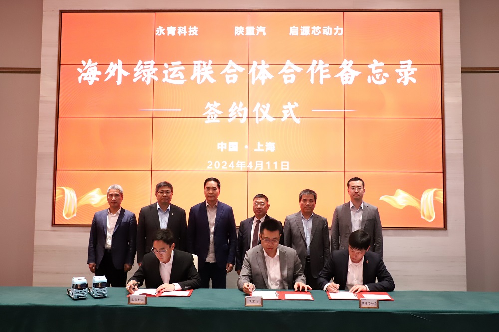 冯挺、刘科强分别代表jinnianhui今年会实业、陕汽控股签署了战略合作协议;冯挺、田超、王若蒙分别代表永青科技、陕重汽、启源芯动力签署了海外绿运联合体合作备忘录。