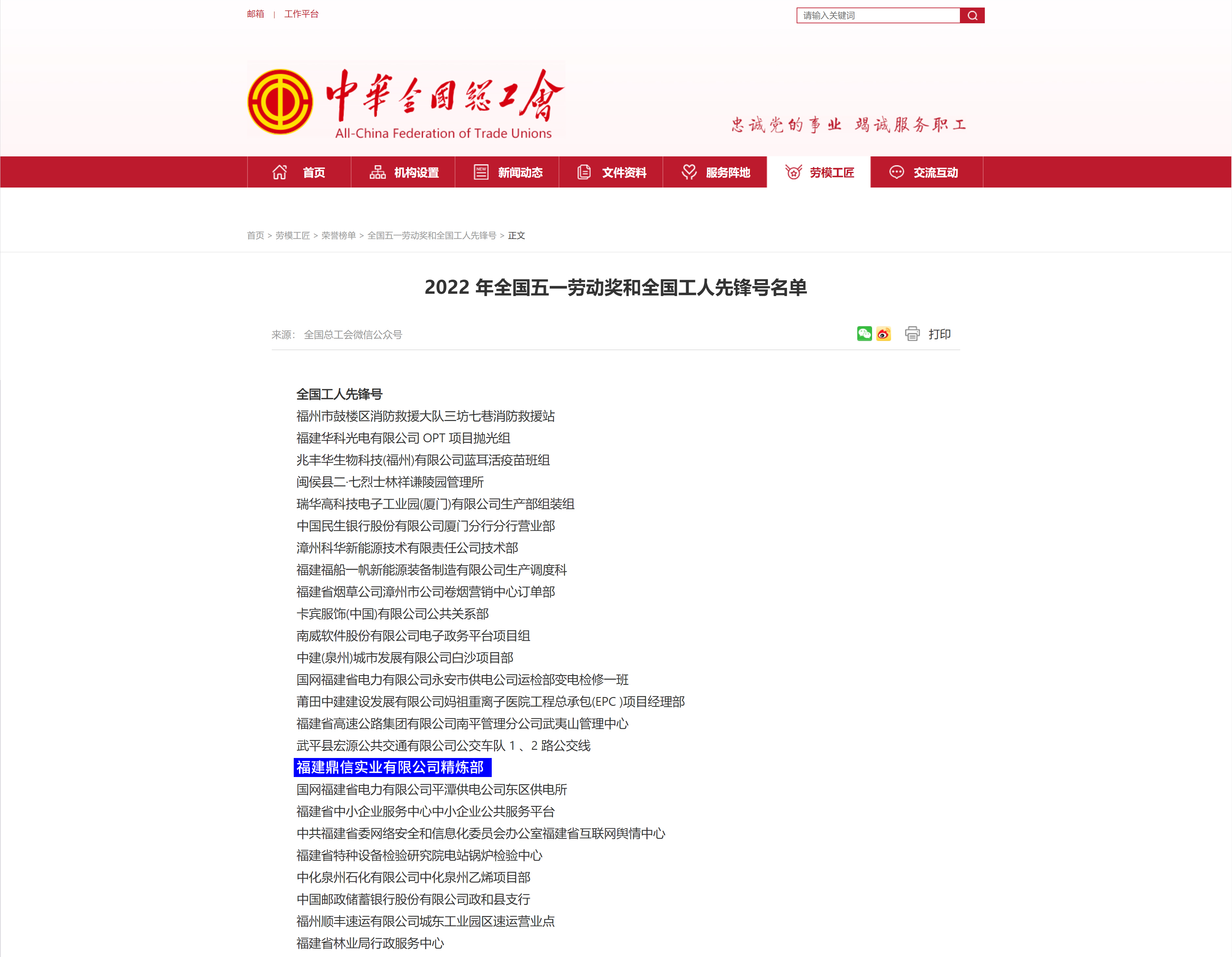 4月28日,中华全国总工会公布了2022年“全国五一劳动奖”和“全国工人先锋号”表彰名单,福建青拓实业有限公司精炼部被授予“全国工人先锋号”荣誉称号。