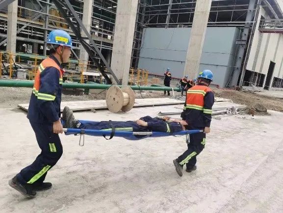 此次演练模拟电工人员触电倒地,监护人发现后立即使受害人员脱离电源、通知安全救援小组,然后在附近安全地带就地抢救。救援组到达现场后接手抢救并维护现场秩序,最终伤员成功苏醒并送入医院观察治疗。