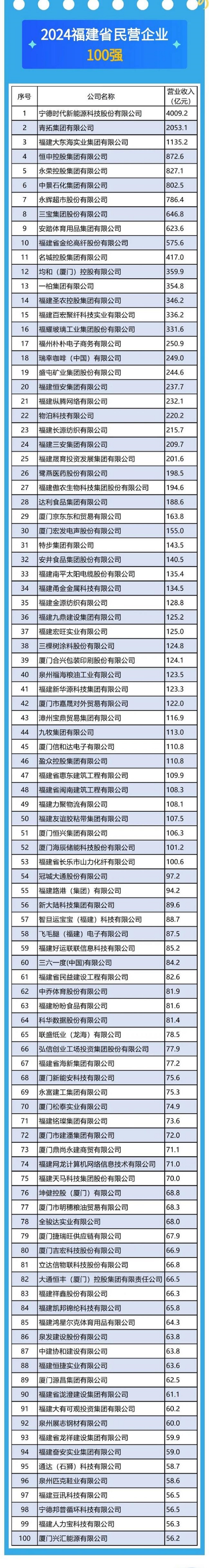 9月19日,福建省工商联发布2024福建省民营企业100强、制造业民营企业100强、服务业民营企业100强、创新型民营企业100强和民营企业社会责任100佳5个榜单。青拓集团有限公司凭借其卓越的经营业绩和强大的综合实力,再次脱颖而出,荣获福建省民营企业100强第二名和制造业民营企业100强第二名。